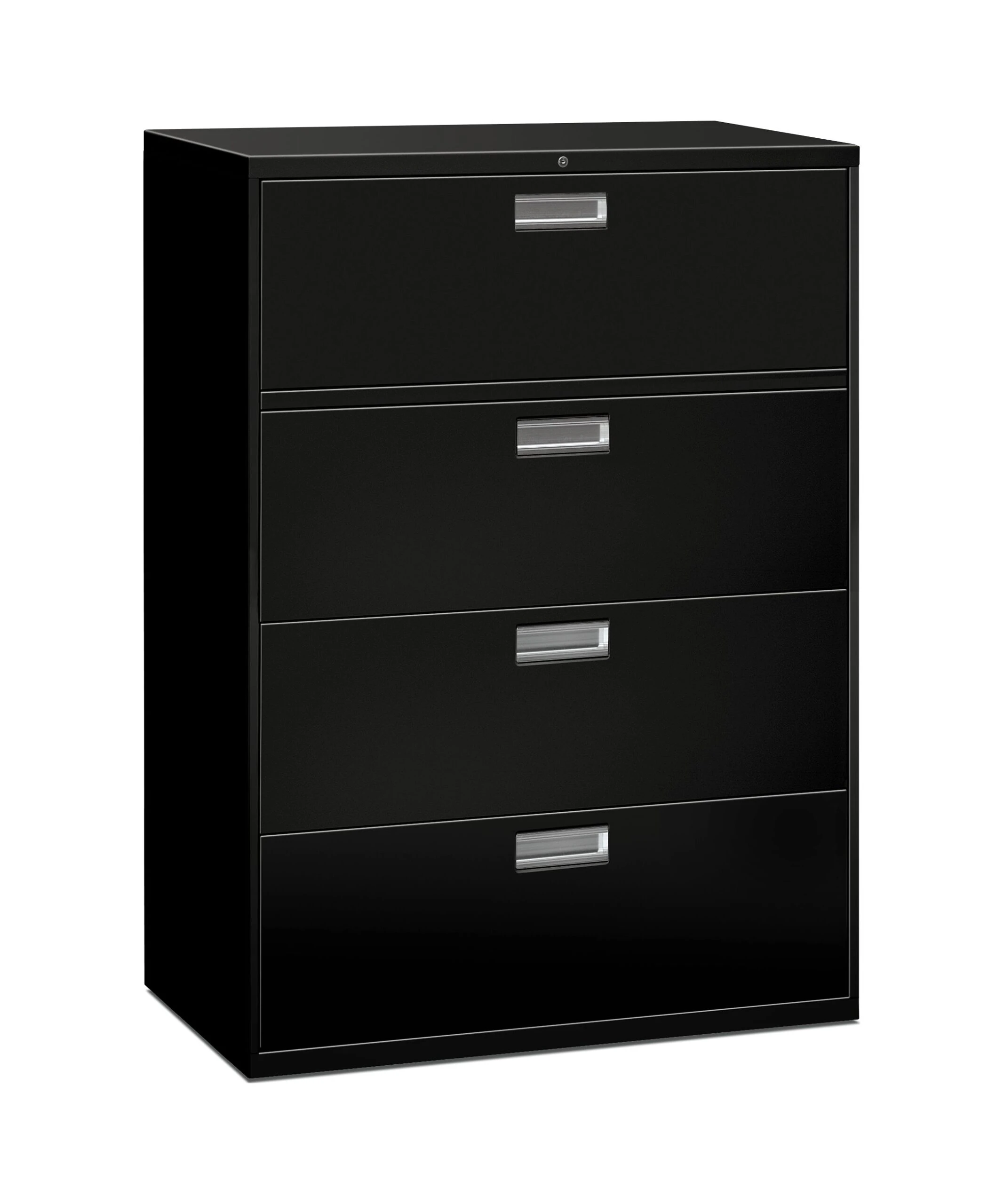 Well-engineered and incredibly strong, Brigade 600 Series laterals from HON are built for the demands of high-activity filing. This four-drawer, 42″W model features a sturdy double-walled base to resist tampering and strengthen the case. It accepts letter or legal hanging file folders. Bright Aluminum handle coordinates with Brigade pedestals. Finish color is Black.