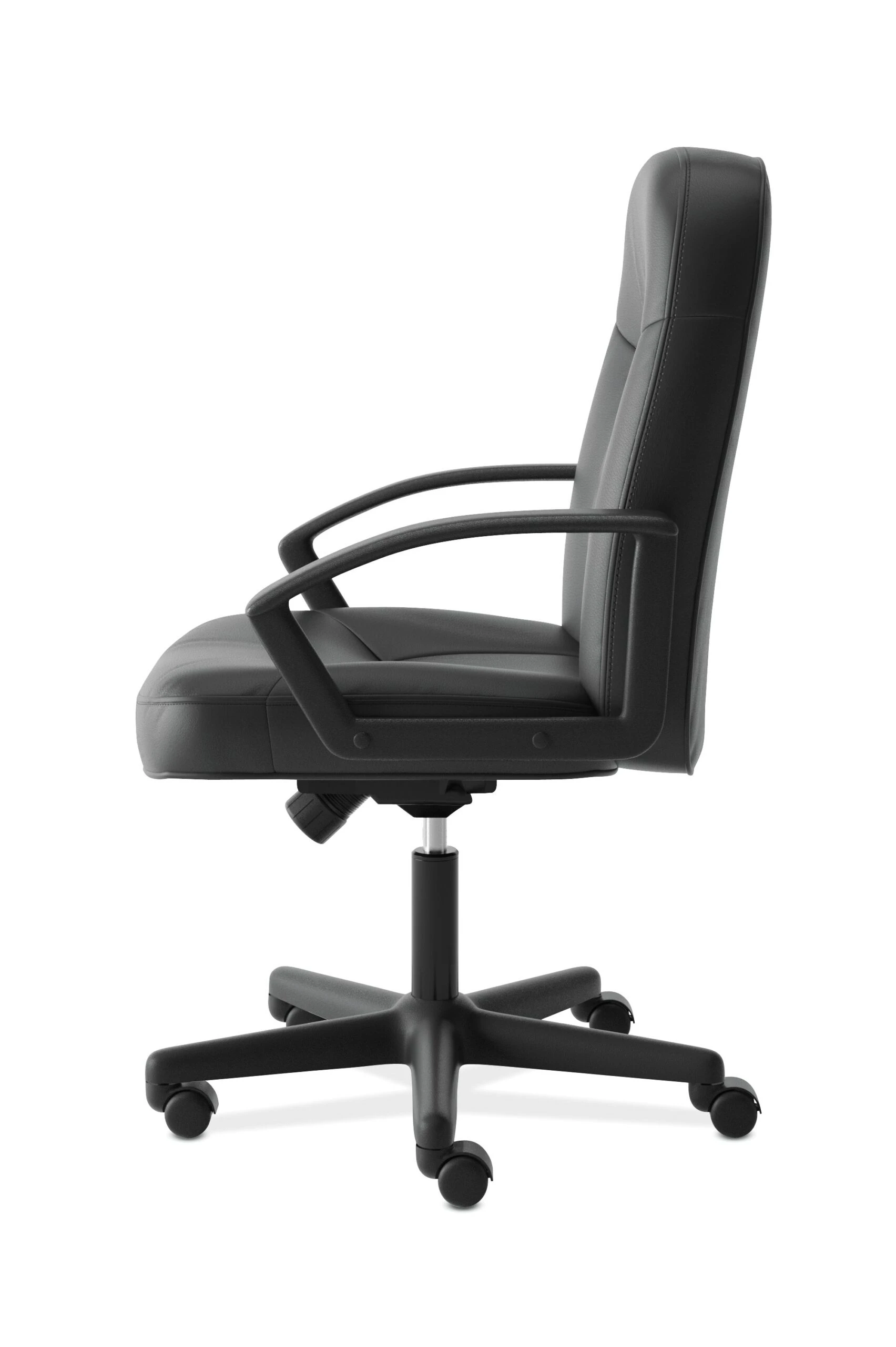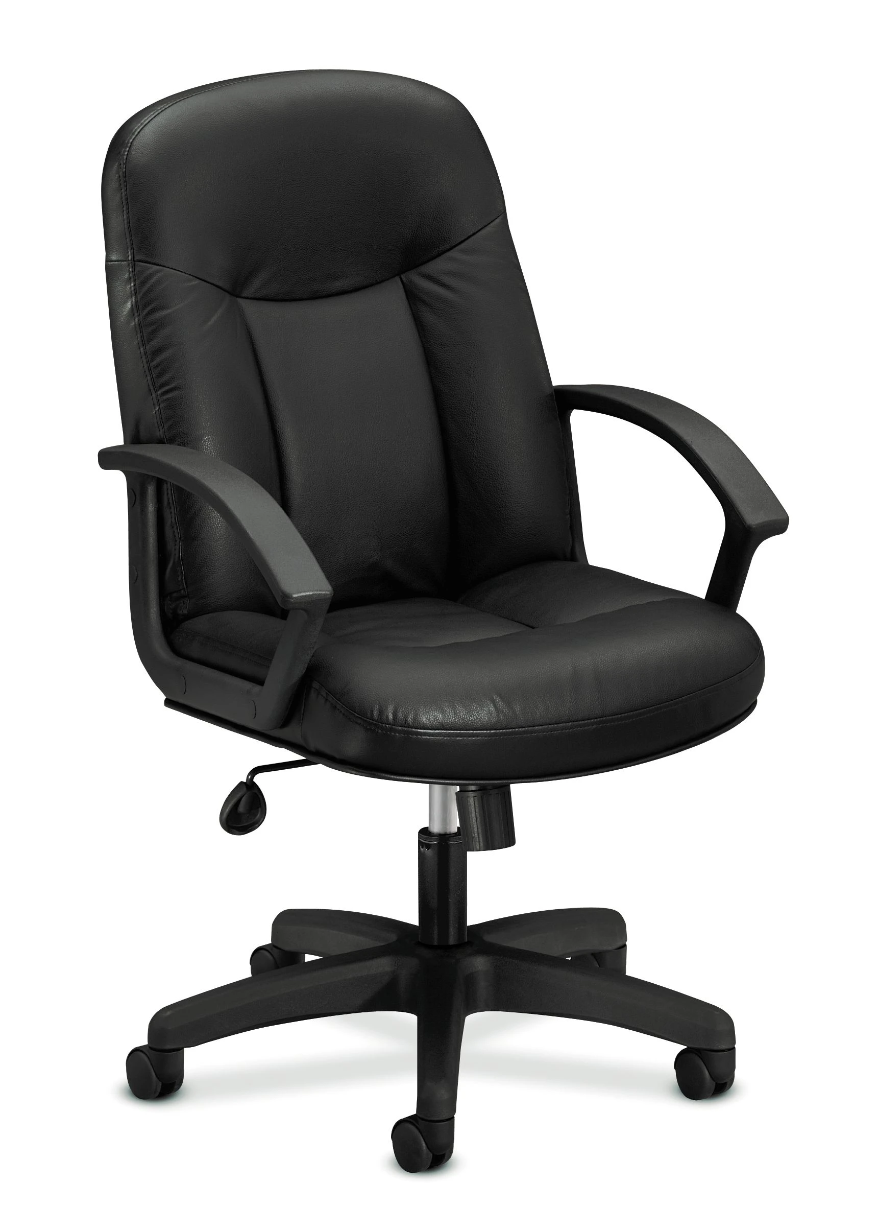 This HON executive high-back chair has center-tilt with lock and tension control. Bonded leather upholstery and tailored stitching give this chair an upscale feel at a compelling price. Seat and back Bonded leather color is Black.