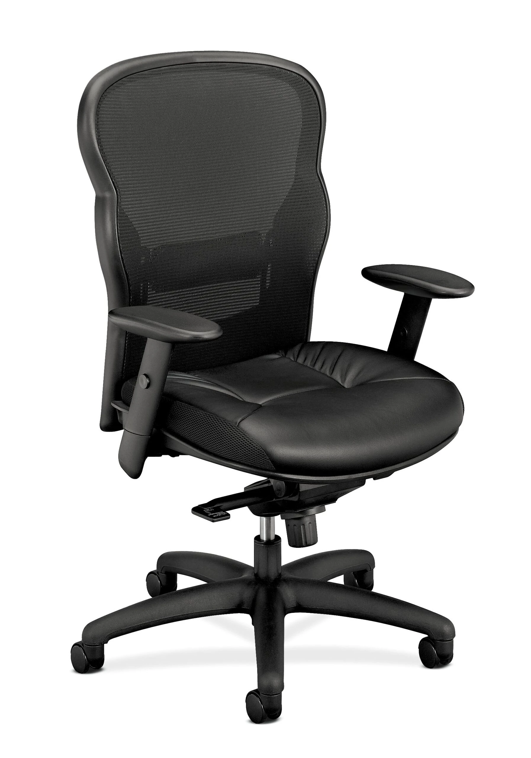 This HON Wave high-back task chair with mesh back has synchronized knee-tilt with lock and tension control. Bonded Leather upholstery, adjustable lumbar support, and height-adjustable arms give this chair an upscale feel at a compelling price. Seat and back Bonded leather color is Black.